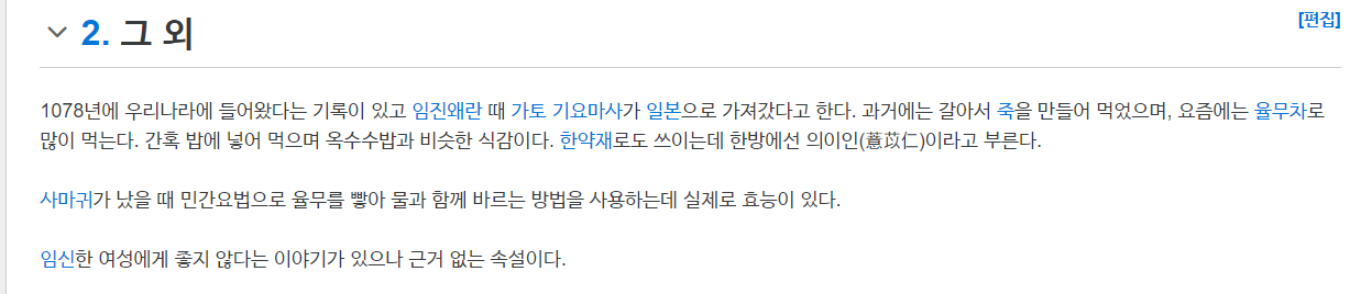 율무는 여러 음식재료나 한약재로 쓰이면서 열을 식히거나 염증을 치료할 때, 신장 기능을 떨어뜨리고 몸에 부종이 생길 때 등 좋은 효과를 많이 주었다고 합니다