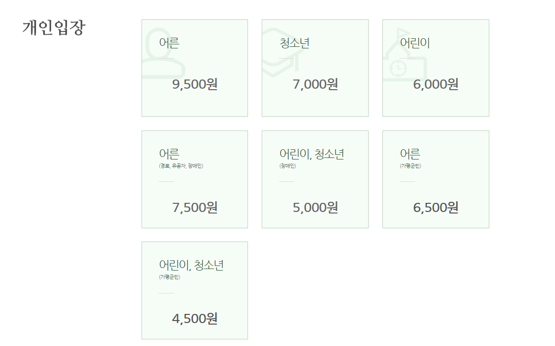 입장료는 단체입장과 개인입장으로 되어있어요.