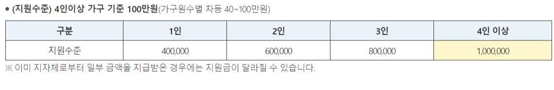 코로나 19로 인해 국내외 경제가 많이 위축하게 되었습니다. 특히 소비심리와 경제활동이 위축되고 민생 경제 전반 어려움이 확대되었기에 소상공인, 자영업자 등 상황이 절실한 상환입니다. 그렇기에 긴급재난 지원금은 코로나 19로 인한 위기에 대응하기 위해 국민 생활 안정과 위축된 경제 회복은 위해 정부가 제공하는 국민 안전망입니다. 지원범위는 전 국민대상 2171만 가구 이며 4인가구 지원은 아래와 같습니다.