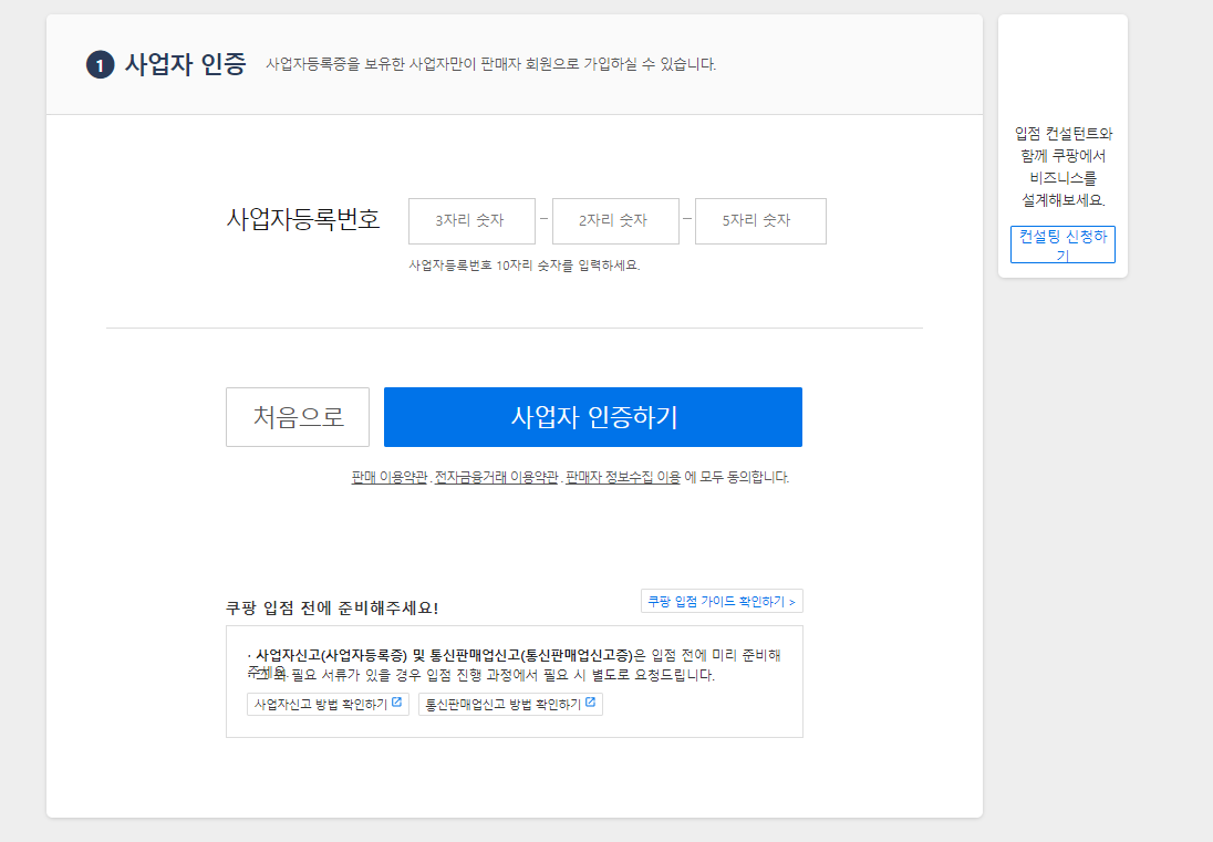 # 3번 : 사업자등록증에 보시면 등록번호라고 있습니다. 사업자등록번호를 넣으시고 사업자 인증하기 버튼을 클릭합니다.