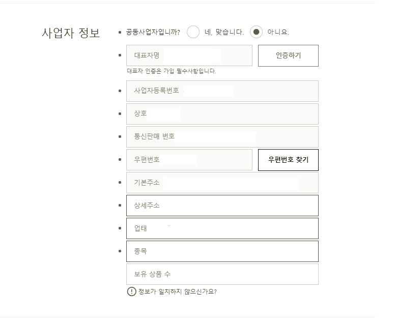 # 4번 : 공동사업자의 경우 "네, 맞습니다"로 표시 하시고 개인사업자의 경우는 "아니요" 로 표시합니다.