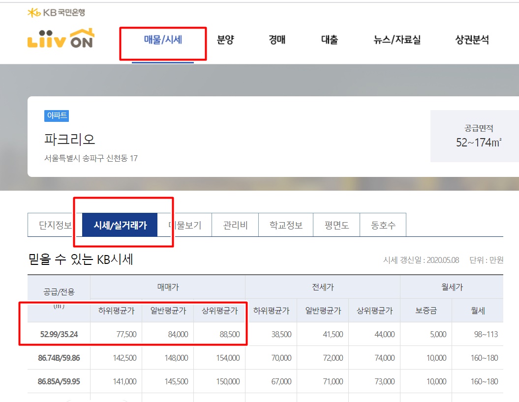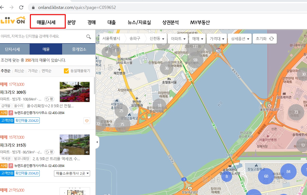 아래 첫번째 사진은 KB 국민은행 아파트 리브온 메인화면입니다. KB 리브온은 아래쪽에 바로가기 링크를 넣었으니 참고하시고요, 홈페이지를 들어가서 맨위 매물/시세를 누르시면 두번째 사진처럼 지도가 뜨는데요. 이때 지도 윗쪽에 시, 구, 동, 아파트 등 찾고 싶은 아파트를 찾으시면 됩니다. 그러면 저렇게 3번째 사진처럼 아파트 시세가 나오게 됩니다. 저는 서울시 송파구 파크리오 아파트를 찾아봤습니다.