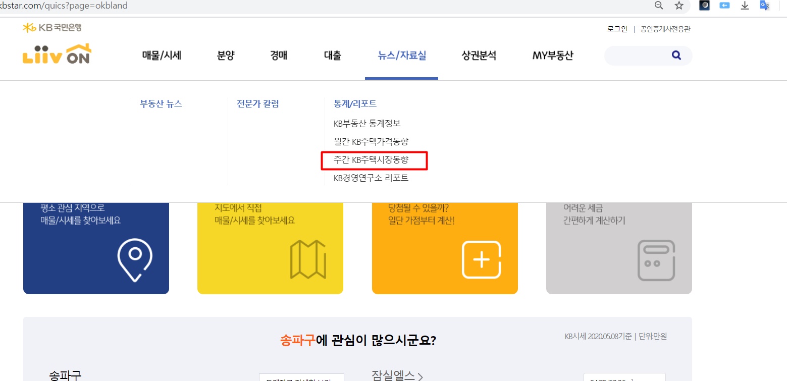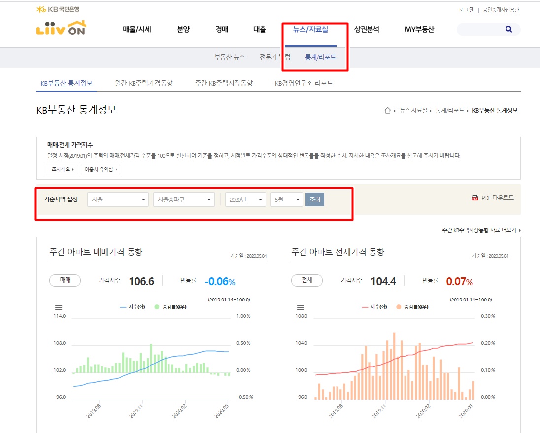KB아파트 시세 첫페이지에 뉴스/자료실쪽에 보시면 통계/리포트가 있습니다. 여기를 클릭하시면 KB부동산 통계정보가 나옵니다. 여기서 서울 송파구를 클릭하고 2020년 5월을 클릭했습니다. 그러면 약 1년동안의 송파구의 매매가격 동향과 전세가격 동향을 쉽게 알수 있습니다.