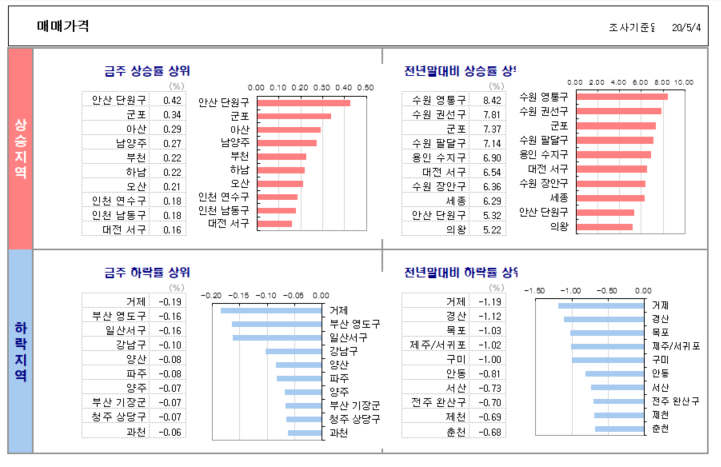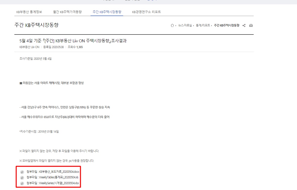 이제 이정도 됐으면 타짜들이 많으실것 같은데요. 부동산은 정말 많은 흐름을 보고 생각도 많이 하는게 좋을것 같습니다. KB 국민은행 아파트 시세에는 정말 좋은 컨텐츠들이 많습니다. KB 아파트 시세 홈페이지 뉴스/자료실을 클릭하시고 주간 KB주택시장동향을 클릭합니다. 그리고 2번째 사진에 서 보시면 아래에 첨부파일이라고 보이시죠? 이때 첨부파일 3개가 나오는데 첫번째는 KB부동산 보도자료가 있습니다. KB 부동산 보도자료를 열어보면 3번째 사진처럼 주간보도자료가 나옵니다. 처음보시면 괜히 따분하고 잘 안읽히겠지만 여러번 보시면 전국적으로 어느 지역이 오르고 내리고를 쉽게 보실수 있을겁니다. 그리고 첨부파일 3번째 파일이 시계열이라는것인데요. 7번째 사진과 8번째 사진을 보시면 전국적인 시세를 한번에 보실수 있습니다. 5월 첫째주 기준으로는 매매가는 안산 단원구가 제일 많이 올랐고 전세가격이 가장 많이 오른곳은 용인 수지구 인것을 알수 있습니다.