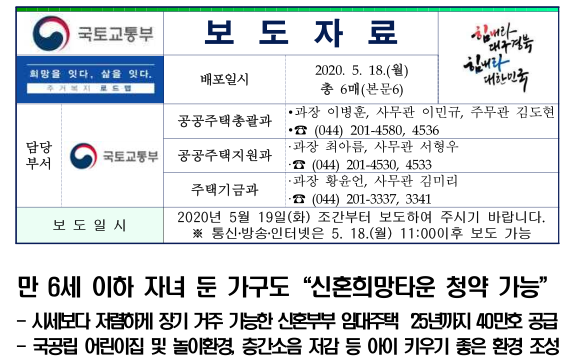 국토교통부(장관 김현미)는 혼인기간 7년 이내 신혼부부 및 예비신혼부부에게만 주어졌던 분양형 신혼희망타운 입주자격을 만 6세 이하 자녀가 있는 가구까지 확대한다.