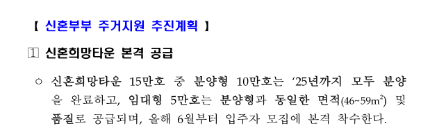 신혼희망타운 15만호 중 분양형 10만호는 ‘25년까지 모두 분양을 완료하고, 임대형 5만호는 분양형과 동일한 면적(46~59m2) 및 품질로 공급되며, 올해 6월부터 입주자 모집에 본격 착수한다.