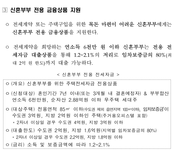 신혼부부를 위한 주택 전세자금 전용상품도 지원된다. 전세계약을 희망하는 연소득 6000만 원 이하 신혼부부는 전용 전세자금 대출상품을 통해 1.2~2.1%의 저리로 임차보증금의 80%(최대 2억 원 한도)까지 대출이 가능하다.