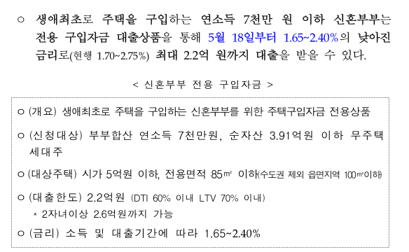 생애최초로 주택을 구입하는 연소득 7천만 원 이하 신혼부부는 전용 구입자금 대출상품을 통해 5월 18일부터 1.65~2.40%의 낮아진 금리로(현행 1.70~2.75%) 최대 2.2억 원까지 대출을 받을 수 있다.