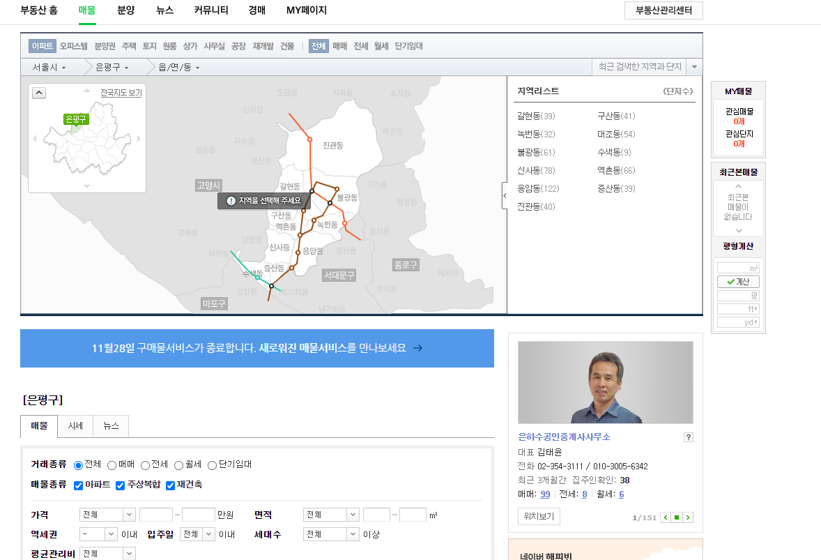 네이버 부동산에서 은평구를 클릭했습니다
