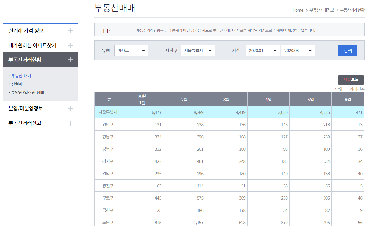 부동산 매매 거래 현황을 볼수 있다.