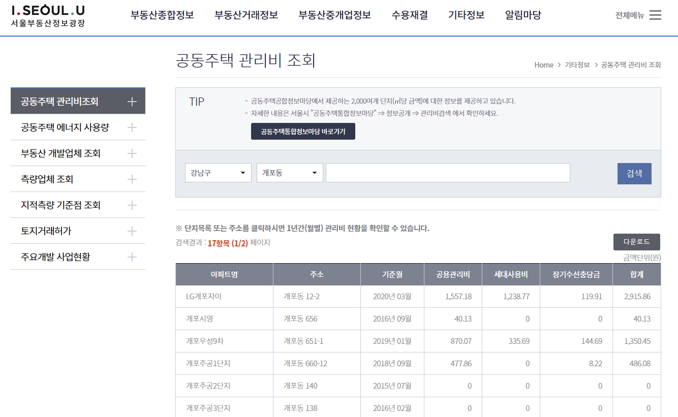 # 서울 부동산 정보광장 - 아파트 관리비